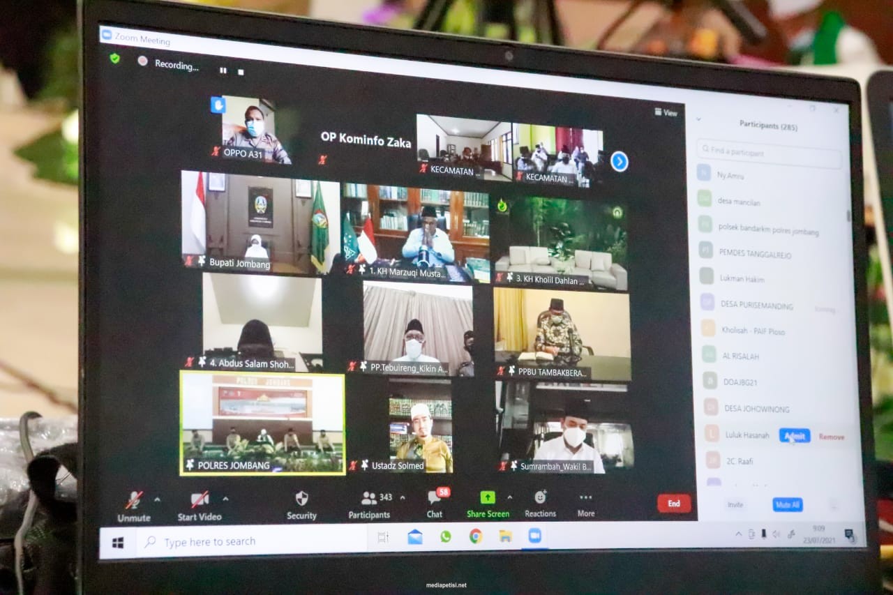 Sementara itu, Ketua Pengurus Wilayah Nahdlatul Ulama (PWNU) Jawa Timur, KH. Marzuki Mustamar juga menyampaikan kepada seluruh masyarakat Indonesia, Jawa Timur, khususnya yang mengikuti zoom meeting bersama Pemerintah Kabupaten Jombang, bahwa tidak cukup menangani covid dengan pendekatan lahiriah atau medis saja akan tetapi harus harus dilengkapi disempurnakan dengan pendekatan batiniah dengan mendekatkan diri kepada Alloh SWT, hindari dan jauhi kemaksiatan, kemunkaran dengan meningkatkan ibadah, doa, dzikir, sholawat memohon ampunan kepada Alloh agar dengan Rohmat, Ridho dan perkenannya Alloh segera menghilangkan musibah ini, tandasnya.