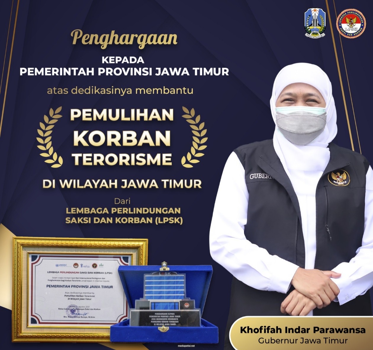 mediapetisi.net – Dalam rangka Peringatan Hari Internasional untuk mengenang dan memberikan Penghormatan terakhir kepada Korban Terorisme, Pemprov Jatim mendapatkan penghargaan dari Lembaga Perlindungan Saksi dan Korban (LPSK). Penghargaan juga diberikan kepada Polda Sulawesi Tengah dan Kabupaten Badung.