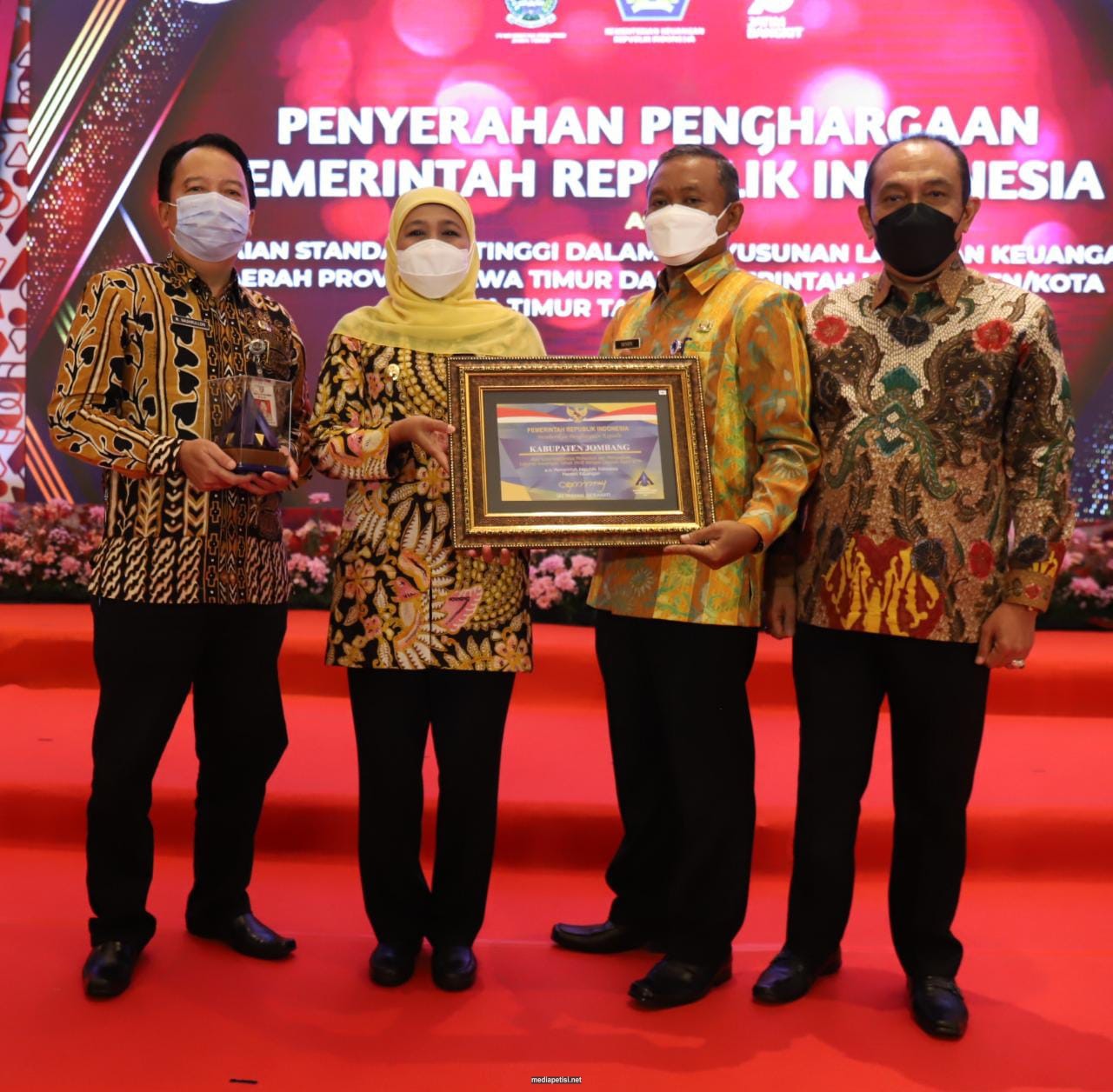 Bertempat di Banyuwangi, Jumat (29/10/2021) Pemerintah Kabupaten Jombang kembali memperoleh penghargaan dari Menteri Keuangan RI yang diserahkan langsung oleh Gubernur Jawa Timur Khofifah Indar Parawansa karena mampu mempertahankan capaian WTP berturut-turut tanpa terputus selama 5 tahun.