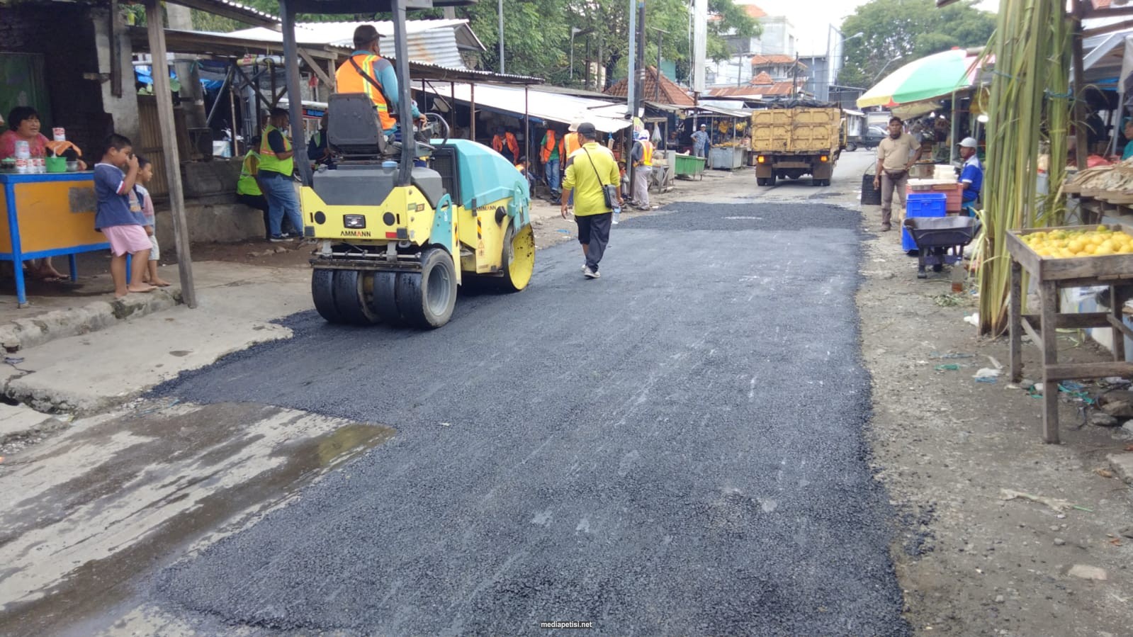Caption Foto : Petugas Dinas PUPR Jombang saat memperbaiki jalan di belakang Pasar Citra Niaga