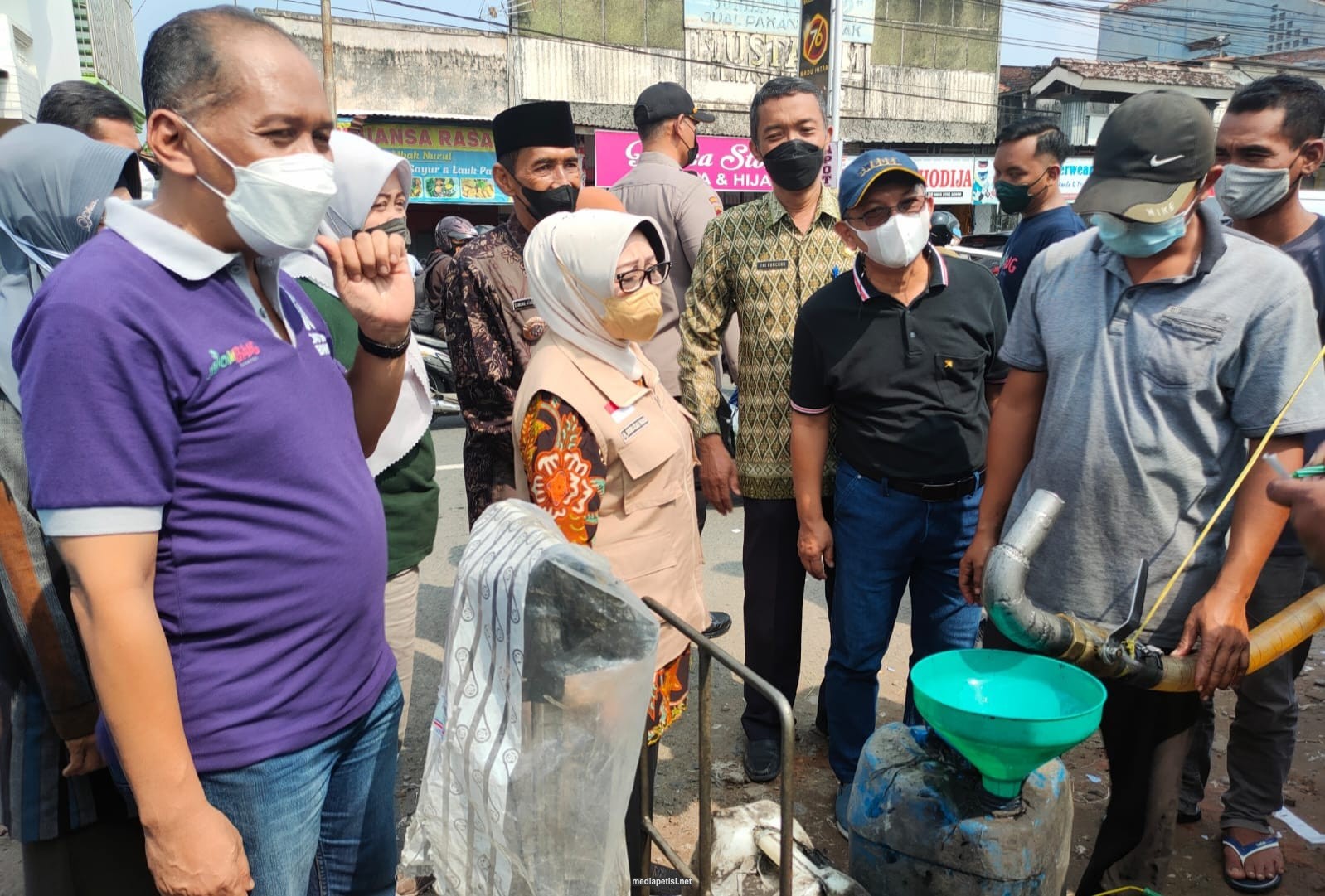 mediapetisi.net – Pemerintah Kabupaten Jombang melalui Dinas Perdagangan dan Perindustrian kabupatrn Jombang melaksanakan proses pendistribusian minyak goreng curah untuk pedagang di Pasar Cukir, Kecamatan Diwek, Kabupaten Jombang, Jawa Timur yang dipantau oleh Bupati Jombang Hj. Mundjidah Wahab. Ikut mendampingi Asisten Perekonomian dan Pembangunan Wignyo Handoko, Kepala Dinas Perdagangan dan Perindustrian Hari Oetomo, Kepala Dinas Ketahanan Pangan dan Perikanan Nur Kamalia, Kepala Bagian Perekonomian Setdakab Jombang Aminatur Rokhiyah serta Jajaran Kepala Bidang pada Disdagrin. Jumat (1/4/2022)