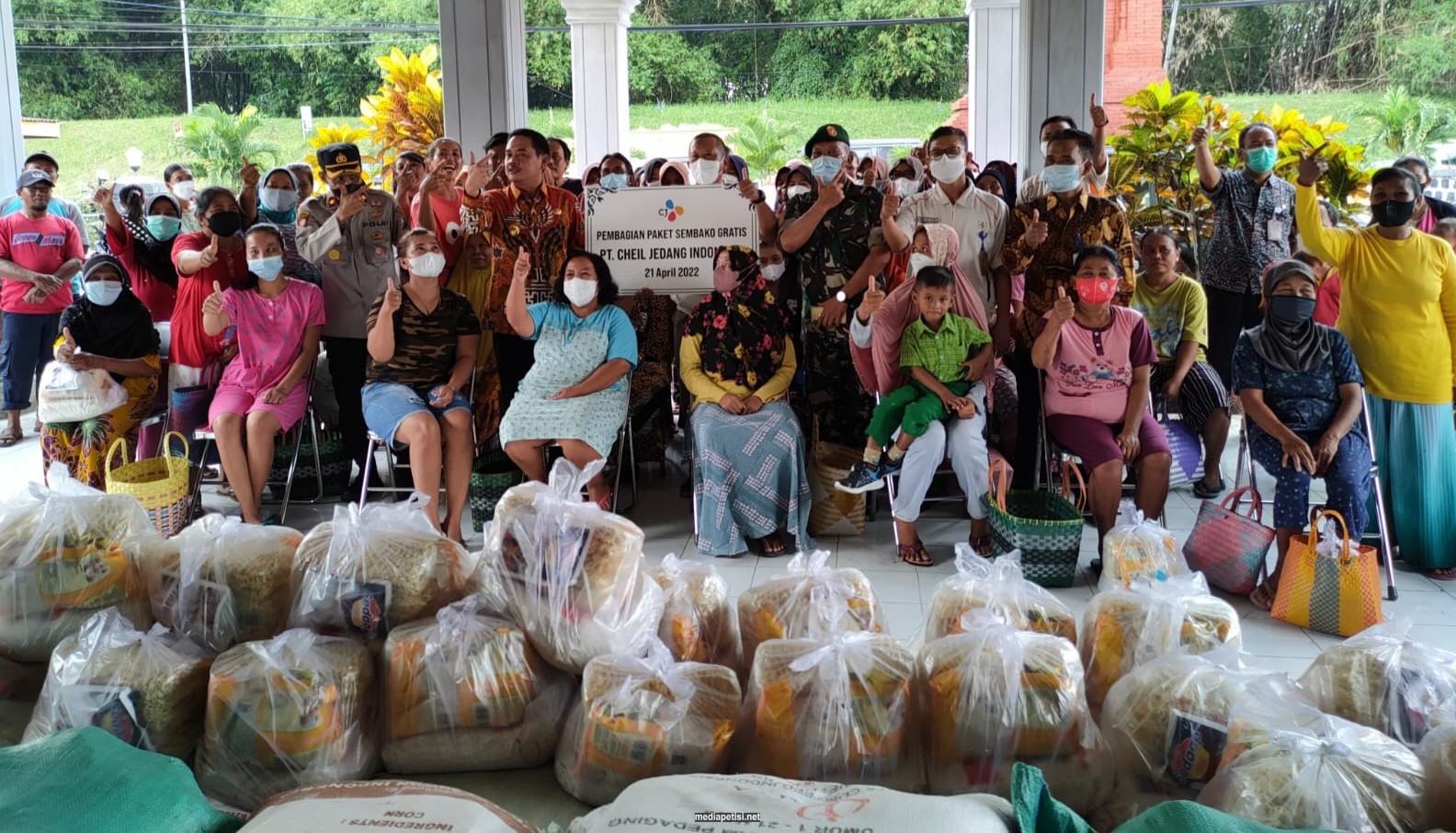 “Atas nama Pemerintah Kabupaten, saya mengajak masyarakat di tiga desa yang menerima bantuan Paket Sembako Gratis dari PT. Cheil Jedang Indonesia untuk menyampaikan ucapan terimakasih langsung kepada jajaran manajemen PT. CJI yang hadir. Ayo kita ucapkan dengan bahasa Korea, Kam Sa Ham Mi Da,” ucapnya.