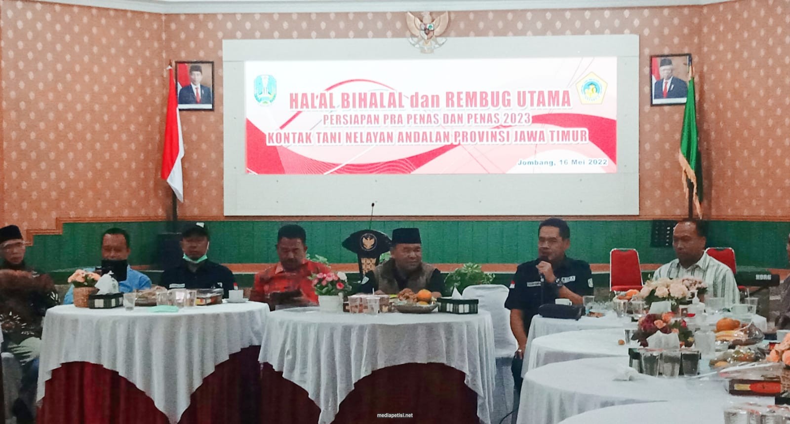 mediapetisi.net – Halal Bihalal dan Rembuk Utama persiapan pra Penas 2023 bersama KTNA (Kontak Tani Nelayan Andalan) provinsi Jawa Timur. Dihadiri Ketua KTNA Jawa Timur Sumrambah beserta ketua harian dan ketua KTNA Kabupaten se Jawa Timur. Bertempat di ruang Bung Tomo Kantor Pemkab Jombang. Senin (16/5/2022)