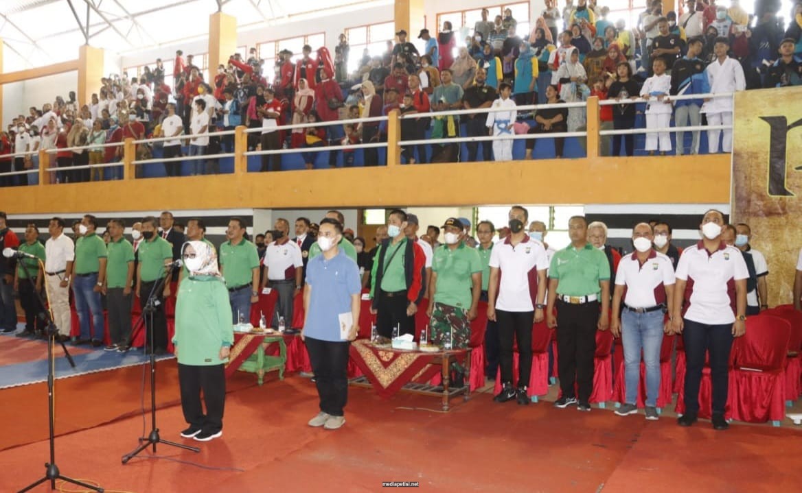 mediapetisi.net – Bupati Jombang Hj Mundjidah Wahab membuka pertarungan Kejuaraan Karate-ka antar pelajar se-Jawa Timur selama 2 hari 28-29 Mei 2022 ditandai dengan pemukulan gong. Dihadiri Wakil Bupati Sumrambah, Kapolres Jombang AKBP M Nur Hidayat, didampingi Pejabat Utama Polres, Sekdakab Jombang Agus Purnomo, Kepala Dinas Pendidikan dan Kebudayaan Senen, S.Sos, M.Si, Ketua Umum KONI Kabupaten Jombang Heru Ariwanto, Ketua FORKI Jombang Kwat Prayitno dan Wasit Juri pertandingan serta disaksikan peserta. Bertempat di GOR Merdeka Jombang. Sabtu (28/5/2022)