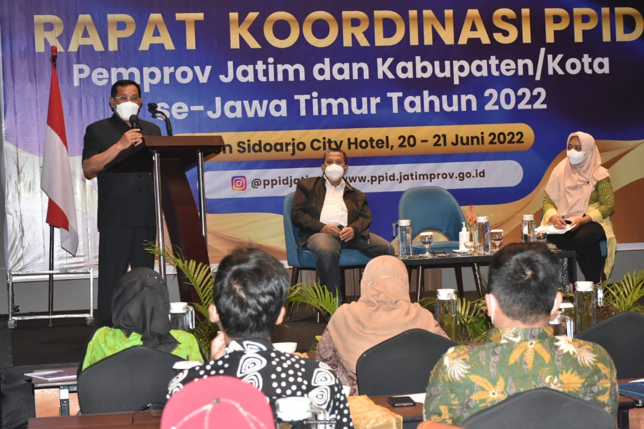 mediapetisi.net – Dinas Komunikasi dan Informatika (Diskominfo) Jatim menggelar Rapat Koordinasi PPID Pemprov Jatim dan Kabupaten/Kota se-Jawa Timur tahun 2022. Rakor berlangsung dari tanggal 20-21 Juni 2022 di Sidoarjo City Hotel yang diikuti oleh pengelola PPID dari OPD Pemprov Jatim serta kabupaten/ kota se Jatim.