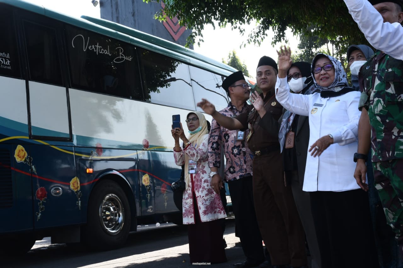 mediapetisi.net – Bupati Jombang Hj Mundjidah Wahab didampingi Forkopimda, Kepala Kementerian Agama Kabupaten Jombang serta Kepala OPD terkait melepas keberangkatan 441 Jamaah Calon Haji asal Kabupaten Jombang Kloter 35 dari Pendopo Kabupaten Jombang, Rabu (29/6/2022)