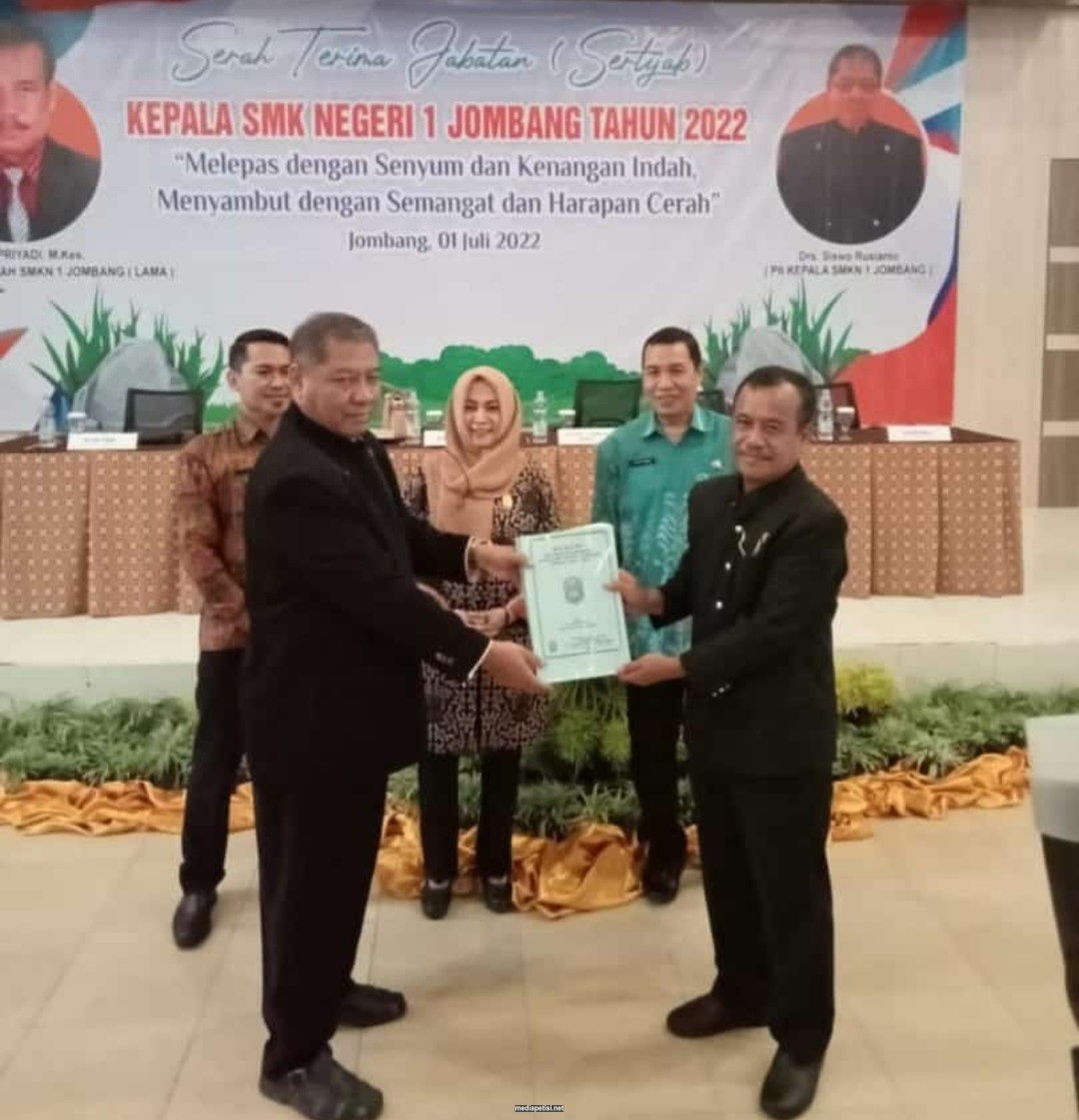 mediapetisi.net – Serah terima jabatan Kepala SMK Negeri 1 Jombang, Drs. Supriyadi, M. Kes kepada Drs. Siswo Rusianto. Dihadiri Kepala cabang Dinas Provinsi Jawa Timur Wilayah Kabupaten Jombang beserta jajarannya, segenap guru SMKN 1 Jombang dan segenap guru SMKN Gudo. Bertempat di Aula SMK Negeri 1 Jombang. Jum’at (01/07/22)