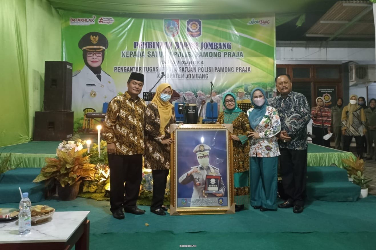 mediapetisi.net – Pembinaan Bupati Jombang kepada Satuan Polisi Pamong Praja (Satpol-PP) dalam rangka pengantar tugas Kepala Satuan Polisi Pamong Praja Kabupaten Jombang. Dihadiri Asisten 1 Purwanto, Kepala Satpol-PP, Pejabat Struktural dan segenap anggota serta pengurus dan anggota dharma wanita persatuan unit pelaksana Satpol-PP. Bertempat di halaman Kantor Satpol PP Kabupaten Jombang. Kamis malam (07/07/22)