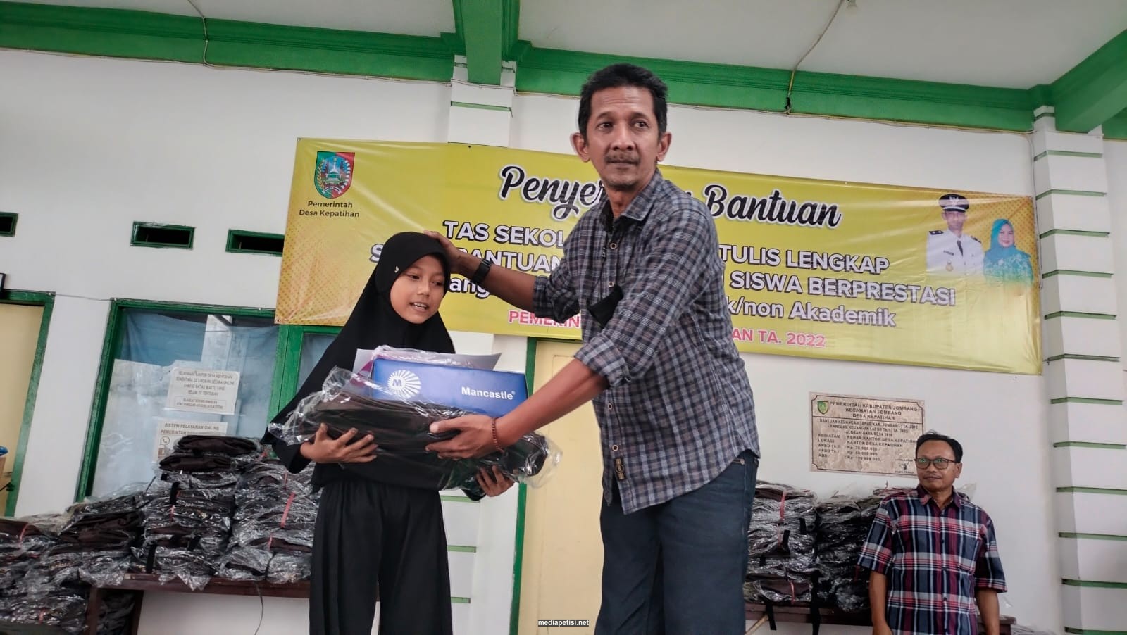 mediapetisi.net – Pemerintah Desa Kepatihan memberikan bantuan tas sekolah dan alat tulis bagi anak – anak Warga Desa Kepatihan. Dihadiri Camat Jombang Sudiro Setiono, Kabag. Pemerintahan Mudlor dan Kepala Desa beserta Perangkat Desa. Bertempat di Balai Desa Kepatihan Kecamatan/Kabupaten Jombang. Sabtu Sore (16/7/2022)