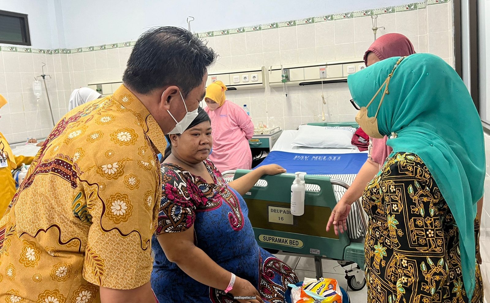 mediapetisi.net – Bupati Jombang Hj. Mundjidah Wahab didampingi drg. Budi Nugroho Kepala Dinas Kesehatan Kabupaten Jombang ke RSUD Kabupaten Jombang sambangi sekaligus silahturahmi dengan keluarga Rohma Roudotul Janah (29) dan Yopi Widianto (26) warga Dusun Slombok, Desa Plemahan, Kecamatan Sumobito, Jombang.