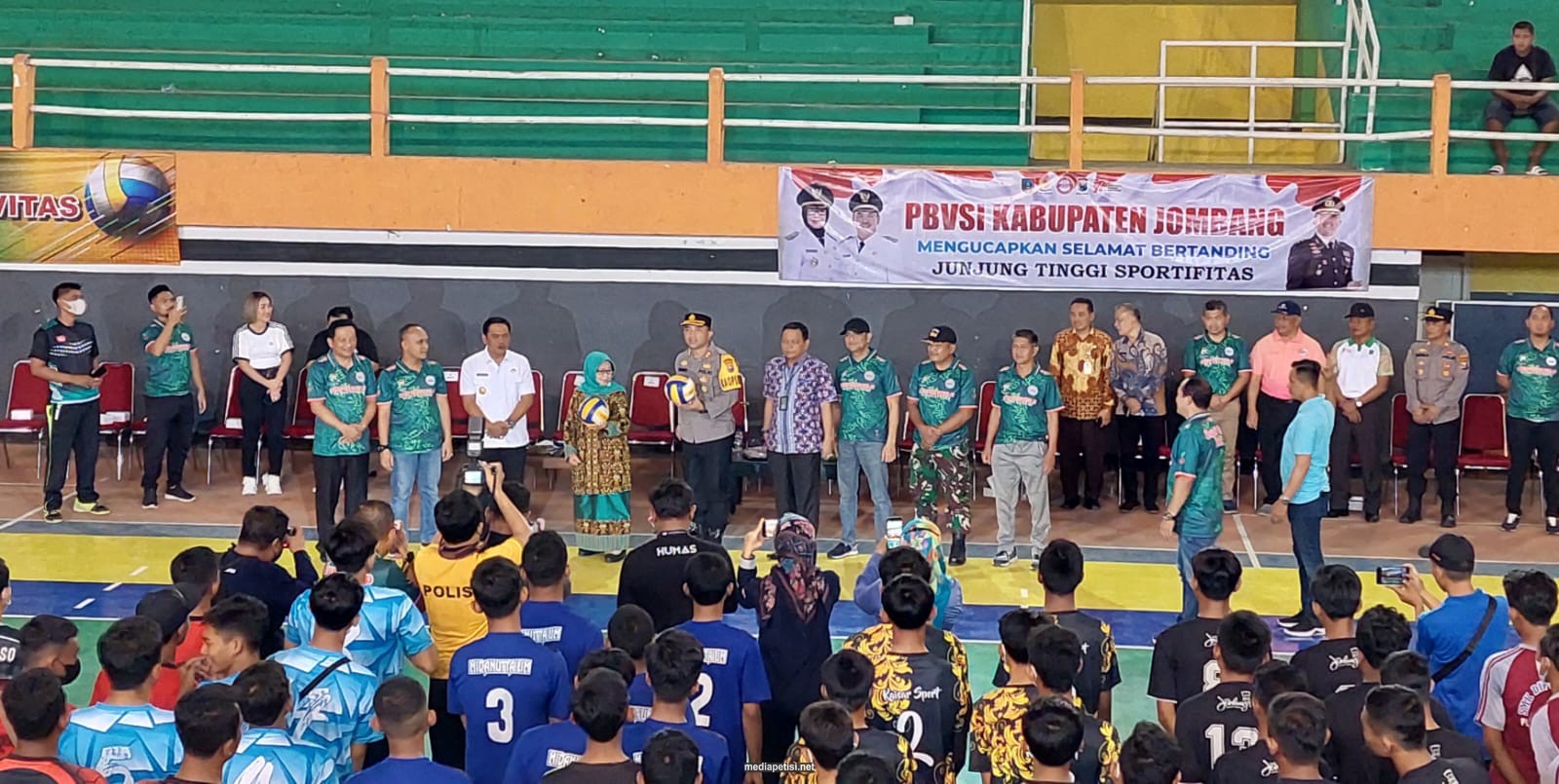 mediapetisi.net – Kejuaraan bola voli Bupati Cup Tahun 2022 antar pelajar putra-putri SMA/SMK/MA se Kabupaten Jombang dibuka oleh Bupati Jombang Hj Mundjidah Wahab. Dihadiri Wakil Bupati, Kapolres, Dansatradar 222 Ploso, Kajari, Ketua PN, Perwakilan Dandim 0814, Sekda, Kepala Disporapar, Kepala Dinsos, Kepala Disdikbud, Kabag. Organisasi, Ketua Umum KONI Kabupaten Jombang, Kasat Reskrim Polres Jombang selaku Ketua Harian PBVSI Kabupaten Jombang dan diikuti peserta. Bertempat di GOR Merdeka Jombang. Jum’at sore (26/8/2022)