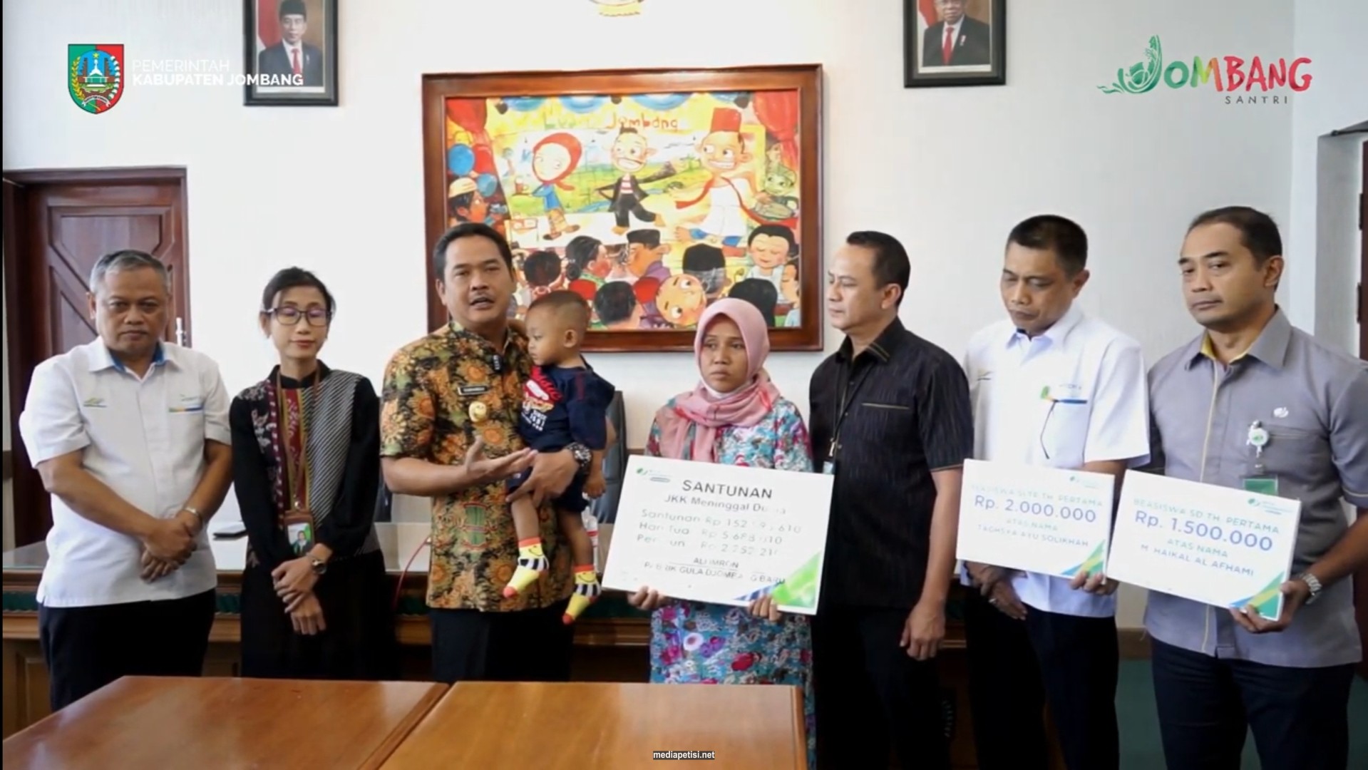 “Hari ini saya bersama BPJS Ketenagakerjaan menyerahkan santunan kepada keluarga korban yang meninggalkan seorang istri dan tiga anaknya yang masih duduk di bangku SMP, SD, dan yang satu lagi masih balita yang lagi saya gendong ini”, tutur Wakil Bupati Jombang Sumrambah.