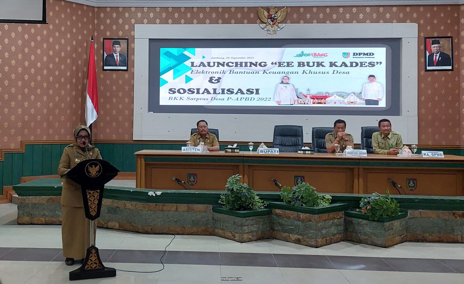 Launching EE BUK KADES dan Sosialisasi Bantuan Keuangan Khusus (BKK) Sarpras Desa P-APBD tahun 2022 oleh Bupati Jombang Hj. Mundjidah Wahab. Dihadiri Sekretaris Daerah, Asisten 1, Kepala DPMD, Camat dan Kepala Desa. Bertempat di ruang Bung Tomo Kantor Pemkab Jombang. Senin sore (26/9/2022)