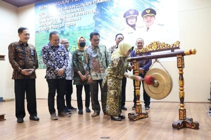 Caption Foto : Bupati Jombang saat memukul gong sebagai tanda dibukanya Bimtek RPD 2024 – 2026