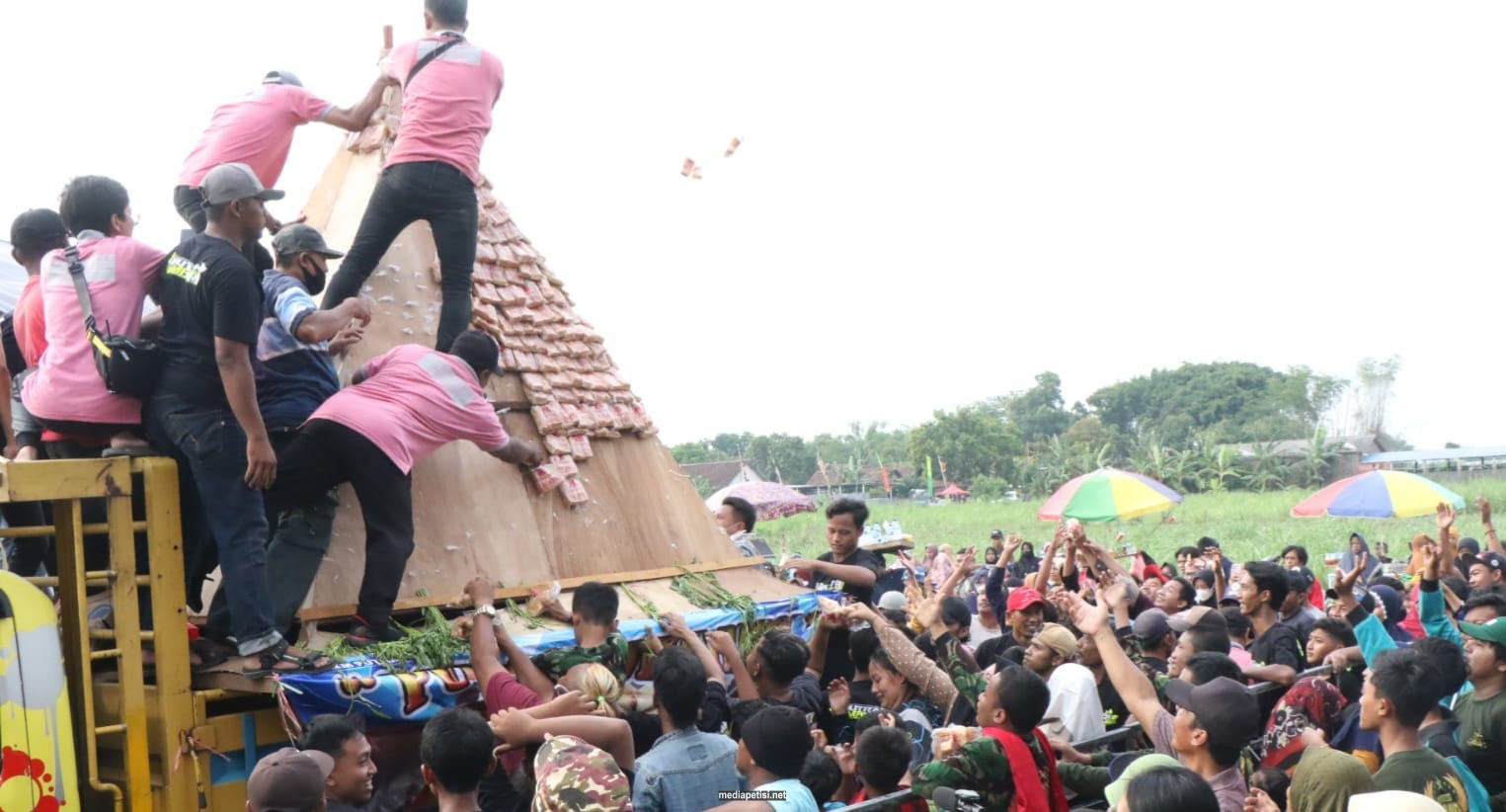 Pawai gunungan tahu tahun ini ada 43 gunungan yang diarak menggunakan mobil pick up, diiringi musik dangdut koplo yang berasal dari sound di barisan depan mulai dari Dusun Bapang dan finish di Lapangan terbuka Dusun Kebon Melati. Kemudian ratusan warga mendekati gunungan tahu, langsung berhamburan dan mengambil tahu.