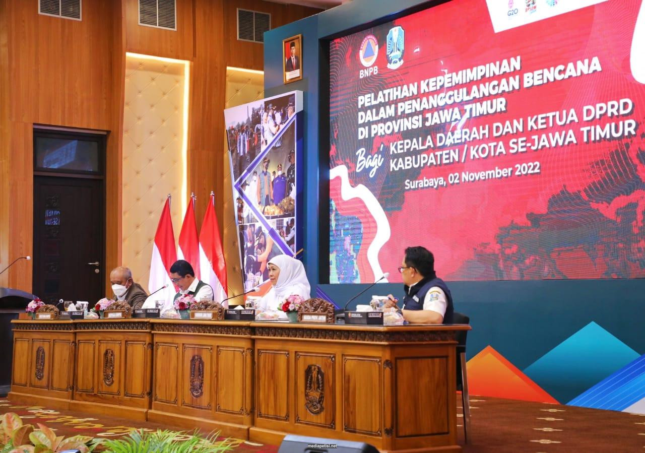 “Mari membangun kewaspadaan, melakukan mitigasi dan antisipasi bencana menjadi penting guna meminimalisir resiko dampak bencana,” pesan Gubernur Khofifah saat menghadiri Pelatihan Kepemimpinan dalam Penanggulangan Bencana Provinsi Jatim yang dihadiri para Kepala Daerah dan Pimpinan DPRD se Jawa Timur, serta dipimpin langsung oleh Kepala BNPB RI Letjen TNI Suharyanto, di BPSDM Provinsi Jatim Jalan Balongsari Tama Surabaya. Rabu (2/11/2022)