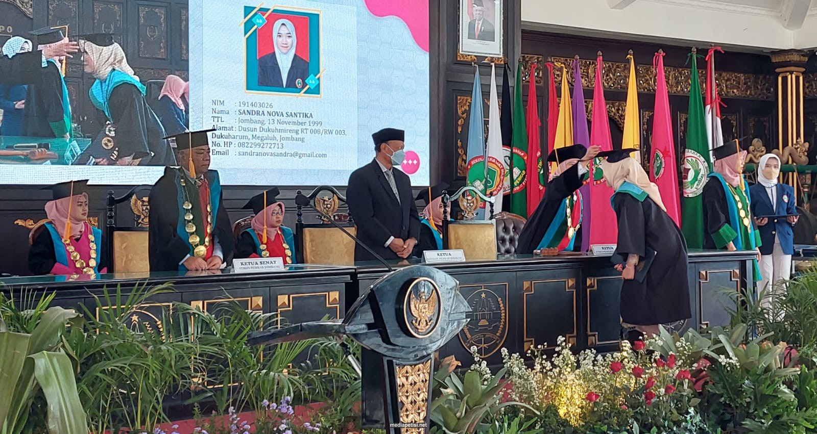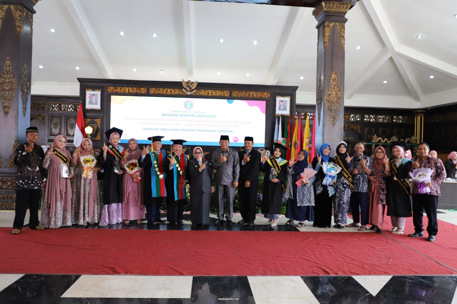 mediapetisi.net – Rapat Senat Terbuka Wisuda dan Pelantikan Diploma III Kebidanan, Diploma III Keperawatan, Sarjana Keperawatan dan Pendidikan Profesi Ners Sekolah Tinggi Ilmu Kesehatan (STIKES) Pemkab Jombang dibuka oleh Ketua STIKES Pemkab Jombang Dr. Ririn Probowati M.Kes. Dihadiri Bupati Jombang, Sekretaris Daerah, Ketua Yayasan STIKES Pemkab, Ketua IPNI Jawa Timur, Perwakilan LDIKTI Wilayah VII, Ketua IDI, Ketua IBI, Kepala BPKAD, Kepala Dinkes, Kepala Bappeda, Direktur RSUD Jombang dàn Direktur RSUD Ploso serta Kabag. Prokopim. Wisuda dilaksanakan secara tatap muka di Pendopo Kabupaten Jombang. Sabtu (12/11/2022)