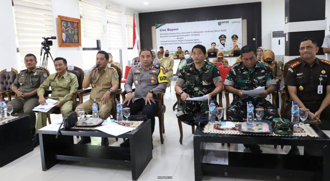 mediapetisi.net – Wakil Bupati Jombang, Sumrambah pimpin pemantauan pelaksanaan pemilihan Kepala Desa serentak tahun 2022 secara virtual. Dihadiri Forkopimda, Kepala Dinas Pemberdayaan Masyarakat Desa (DPMD) Jombang, Perwakilan Dinas Pemberdayaan Masyarakat Desa (DPMD) Provinsi Jawa Timur, dan Kepala Satpol PP. Bertempat di ruang Media Center Kantor Pemerintah Kabupaten Jombang. Senin (21/11/22)