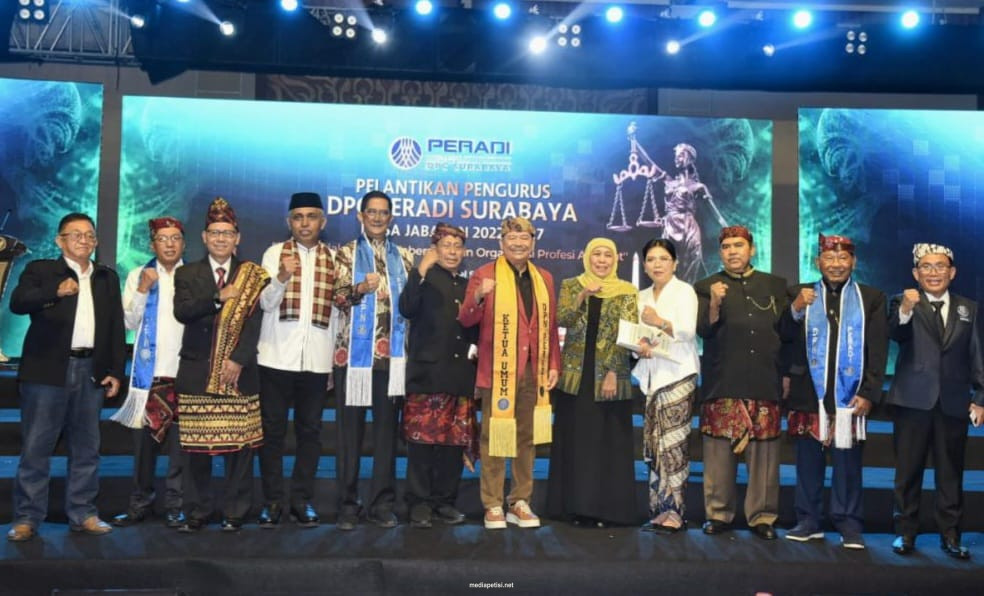 mediapetisi.net – Gubernur Jawa Timur Khofifah Indar Parawansa hadir dalam pelantikan pengurus Dewan Pimpinan Cabang Perhimpunan Advokat Indonesia (DPC PERADI) Surabaya masa jabatan 2022-2027 di Hotel Shangri-La Surabaya. Sabtu malam (14/1/2023)