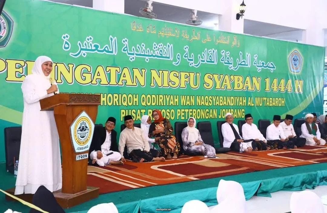 mediapetisi.net – Gubernur Jawa Timur Khofifah Indar Parawansa menghadiri doa Nisfu Sya’ban 1444 Hijriah oleh Jami’iyah Thoriqoh Qodiriyah Wan Naqsabandiyah Al-Muta’baroh (ITQON) Pusat di Pondok Pesantren Darul Ulum, Peterongan – Jombang, Selasa (7/3/2023)