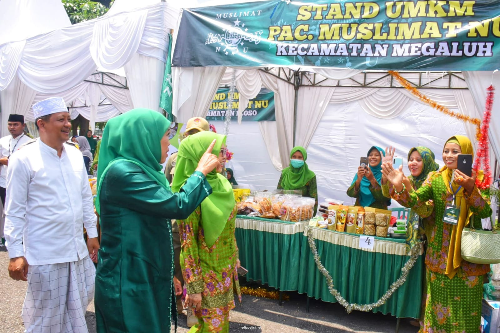 Caption Foto : Gubernur Khofifah didampingi Bupati Jombang dan Sekda saat meninjau stand UMKM yang berasal dari para anggota Muslimat NU se-Kabupaten Jombang yang menjual berbagai macam produk mulai makanan, minuman, pakaian, perhiasan, hingga mainan tradisional.
