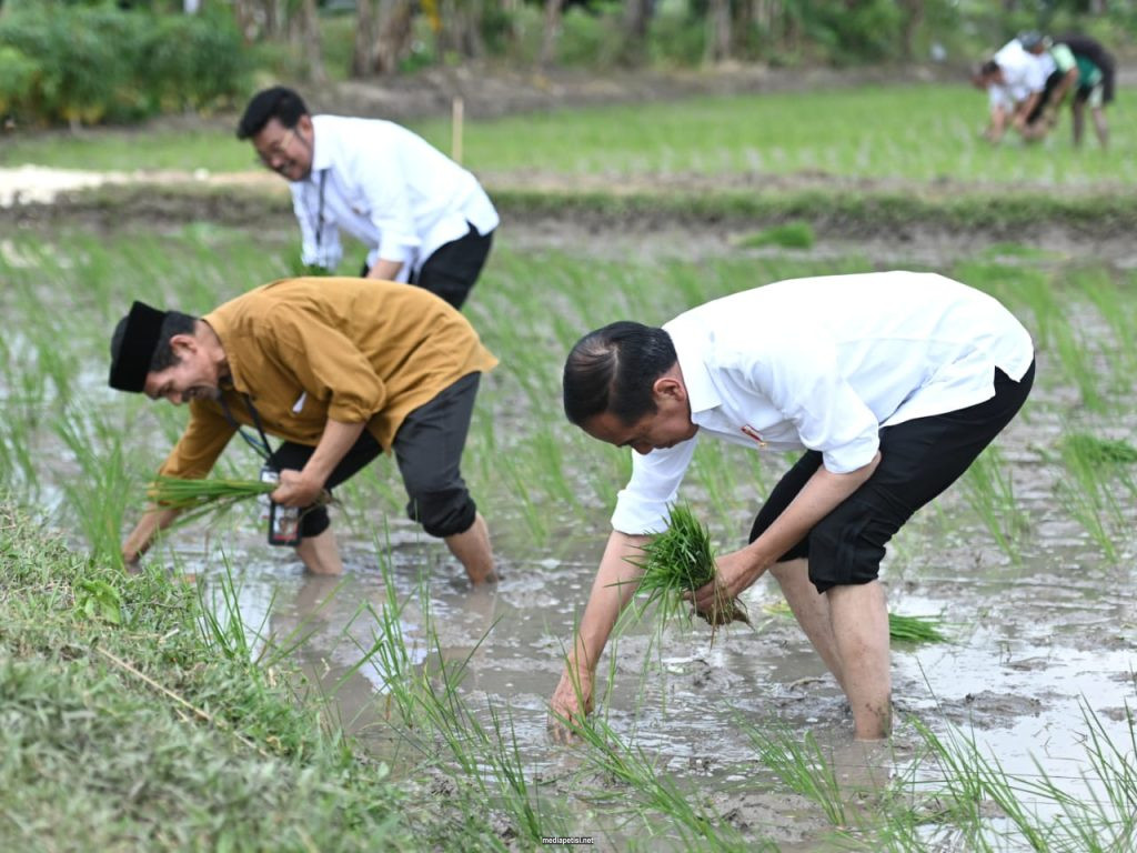 Caption Foto : Presiden Jokowi bersama Mentan Syahrul Yasin Limpo bertanam padi bersama petani di Tuban