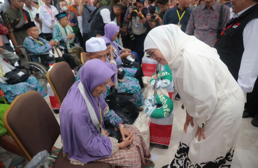 Caption Foto : Gubernur Khofifah saat menyapa para Calon Jamaah Haji sebelum pemberangkatan