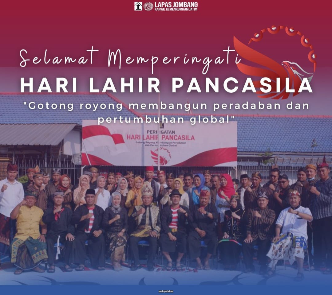 mediapetisi.net – Lembaga Permasyarakatan (Lapas) Kelas IIB Jombang melaksanakan upacara Hari Lahir Pancasila tahun 2023 dengan tema “Gotong Royong Membangun Peradaban dan Pertumbuhan Global” dipimpin Kepala Lapas Jombang Margono. Diikuti Jajaran struktural dan seluruh Pegawai Lapas Kelas IIB Jombang dengan memakai pakaian adat Indonesia. Bertempat di Lapangan Kantor Lapas IIB Jombang. Kamis (1/6/2023)