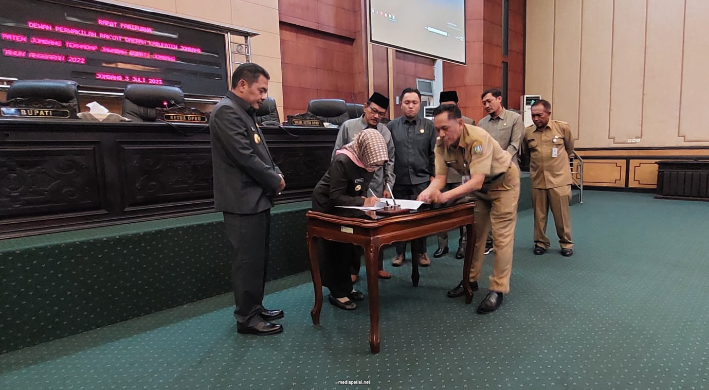 Caption Foto : Bupati Jombang didampingi Wabup dan Pimpinan DPRD saat memandatangani berita acara persetujuan Raperda Pertanggungjawaban Pelaksanaan APBD 2022