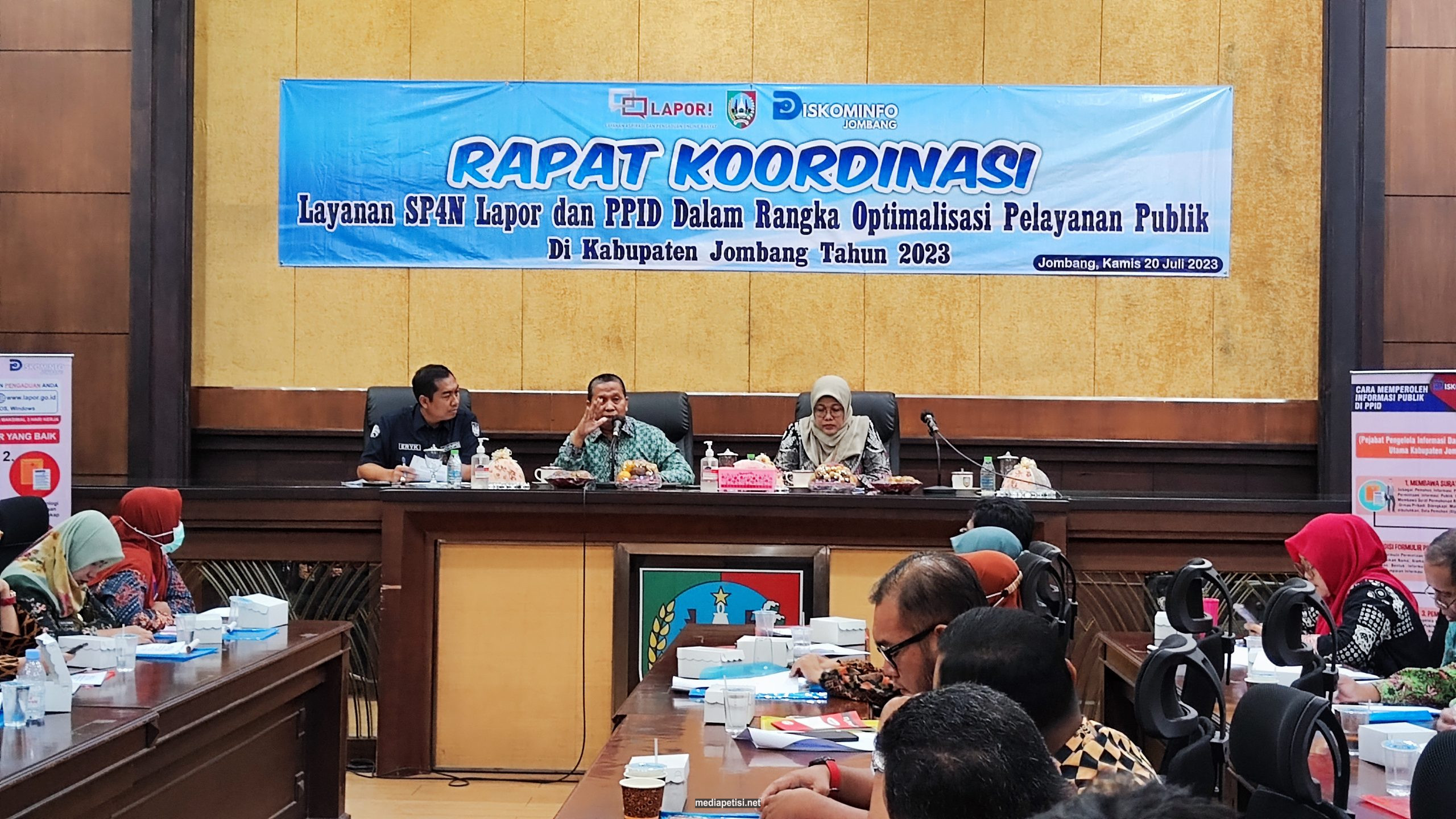 mediapetisi.net – Bidang Humas Komunikasi Publik (HKP) Dinas Komunikasi dan Informatika (Kominfo) Kabupaten Jombang menggelar Rapat Koordinasi (Rakor) Penguatan Layanan SP4N Lapor dan PPID dalam rangka Optimalisasi Pelayanan Publik di Ruang Suro Adiningrat Kantor Pemkab Jombang. Kamis (20/7/2023)