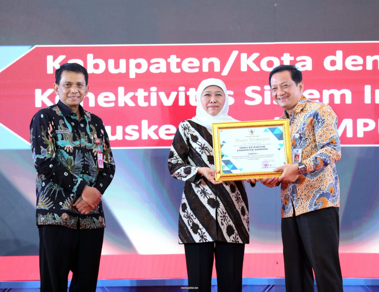 mediapetisi.net – Pemerintah Kabupaten Jombang melalui Dinas Kesehatan menerima Penghargaan dari Gubernur Jawa Timur Khofifah Indar Parawansa. Dinas Kesehatan Kabupaten Jombang sebagai Terbaik I Kabupaten/Kota dengan Capaian Terbaik Konektivitas Sistem Informasi Manajemen Puskesmas (SIMPUS) ke Satusehat. Tidak hanya itu, Kabupaten Jombang juga menerima apresiasi Terbaik II Kabupaten/Kota dengan Capaian Terbaik dalam Pemanfaatan Vaksin Covid-19 Inavac Untuk Pelaksanaan Vaksinasi Covid-19 Periode Januari – Juli 2023.