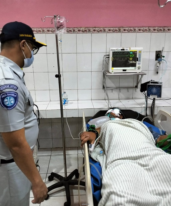 Caption Foto :Pihak PT Jasa Raharja saar menjenguk korban kecelakaan kereta api Dhoho di Jombang