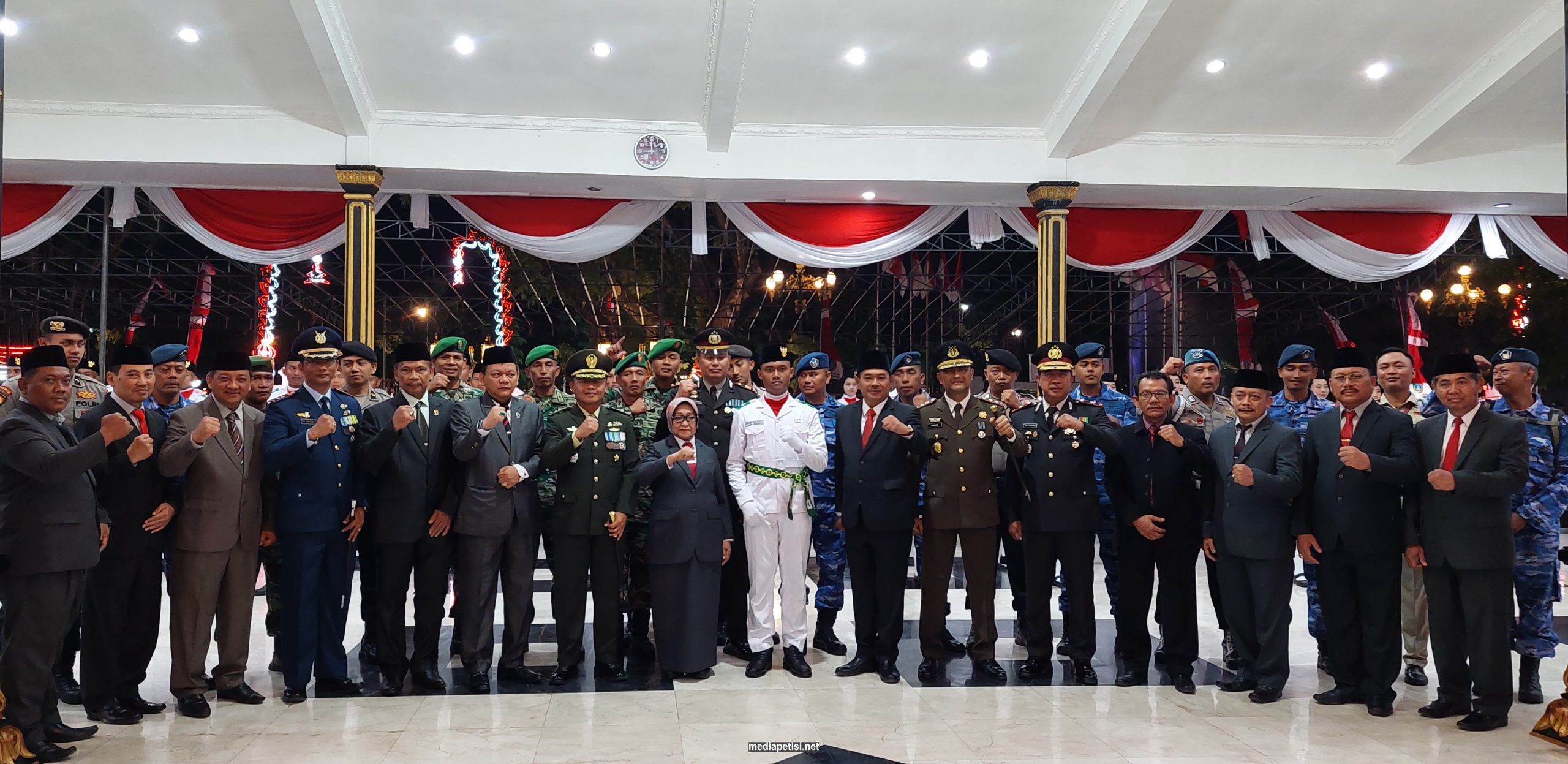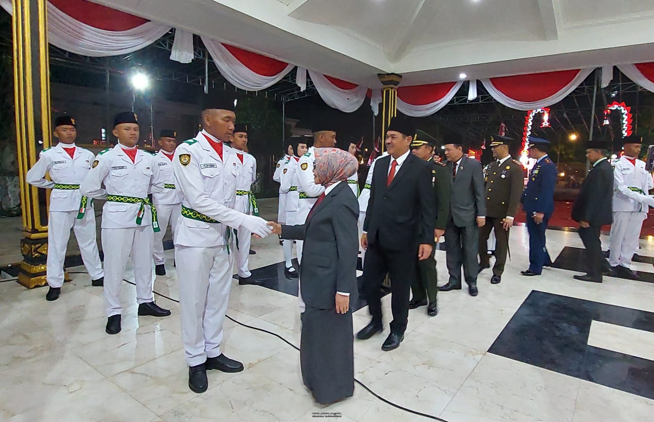 mediapetisi.net – Pengukuhan Anggota Paskibraka (Pasukan Pengibar Bendera Kabupaten) Jombang Tahun 2023 oleh Bupati Jombang Hj. Mundjidah Wahab. Dihadiri Wakil Bupati Jombang, Dansatrad 222 Ploso, Dandim 0814, Ketua PN, Ketua PA, Kajari, Adm Perhutani, Waka Polres, Sekda, Asisten, Staf Ahli, Kepala Disporapar dan Kepala Kesbangpol. Bertempat di Pendopo Kabupaten Jombang. Senin malam (14/8/2023)