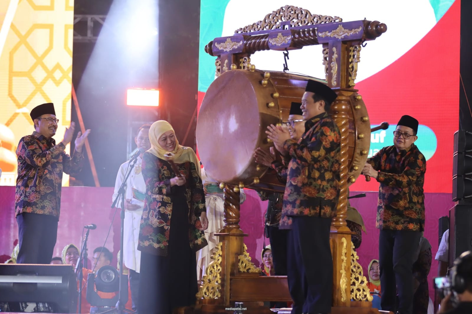 Caption Foto : Gubernur Khofifah bersama Wali Kota Pasuruan Saifullah Yusuf, Sekretaris Daerah Adhy Karyono serta para pejabat saat memukul bedug menandai pembukaan MTQ XXX Jatim 2023