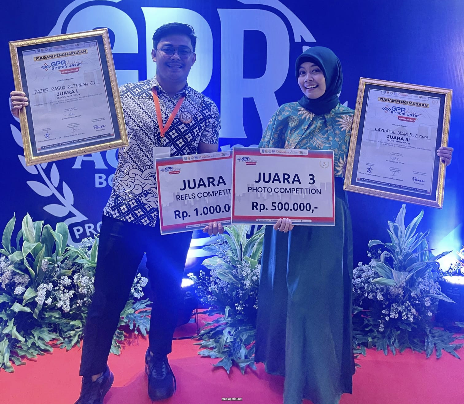 Caption Foto : Juara I Reel Competition Fajar Bagus Setiawan dan Juara III Foto Jurnalistik Laylatul Desia Rohmawati saat menunjukkan penghargaannya