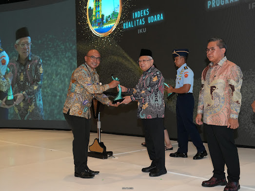 Caption Foto : Kepala DLH Jombang Miftahul Ulum saat menerima penghargaan dari Wakil Presiden Ma’ruf Amin