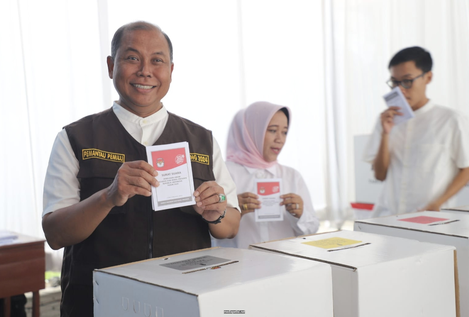 mediapetisi.net – Pj. Bupati Jombang Sugiat bersama istri dan putranya menyalurkan hak pilihnya dalam Pemilihan Umum (Pemilu) 2024 di TPS 001 Kelurahan Kaliwungu Kecamatan/Kabupaten Jombang. Rabu (14/2/2024)