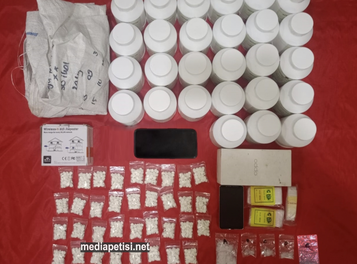 Ketiganya pun tidak melakukan perlawanan saat polisi menggerebek rumahnya. Petugas kemudian menggeledah isi rumah dan menemukan barang bukti sabu dan pil koplo yang disembunyikan di dalam karung plastik putih.