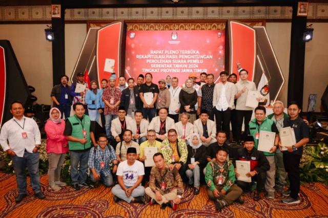 Caption Foto : Anggota KPU Jatim bersama saksi dari calon DPD RI, Partai Politik dan pilpres peserta pemilu usai melakukan pendatanganan hasil rekapitulasi tingkat provinsi di Shangrilla Surabaya.