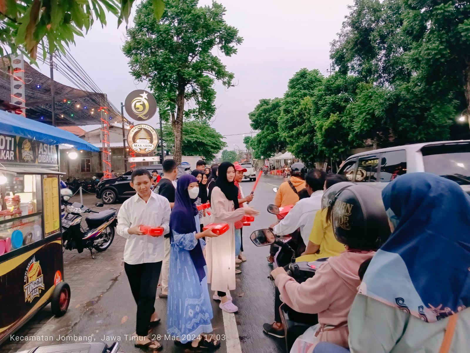Caption Foto : Siswa kelas 7 G SMPN 2 Jombang bersama orang tua murid bagi ta’jil di depan RM Tahta Makarim Jombang