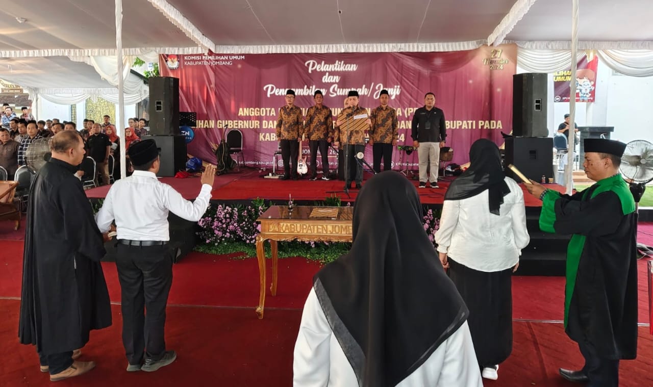 mediapetisi.net – Komisi Pemilihan Umum (KPU) Kabupaten Jombang gelar Pelantikan dan Pengambilan Sumpah/ Janji Anggota Panitia Pemungutan Suara (PPS) untuk Pemilihan Kepala Daerah (Pilkada) Tahun 2024 sebanyak 918 orang yang tersebar di 302 desa dan 4 Kelurahan di Kabupaten Jombang. Masing – masing desa atau kelurahan terdapat 3 orang PPS.