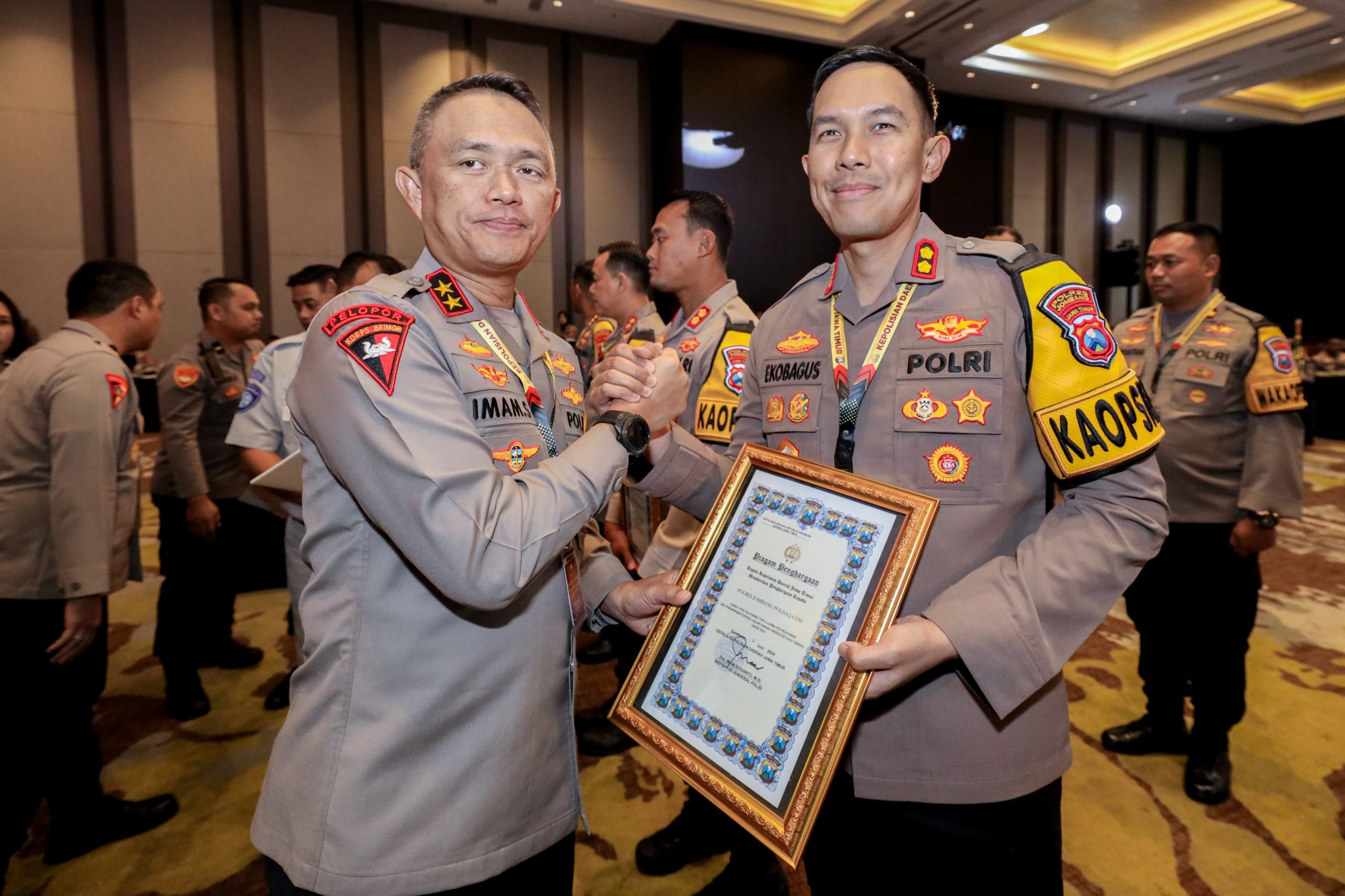 Penghargaan diterima langsung Kapolres Jombang AKBP Eko Bagus Riyadi dari Kapolda Jatim Irjen Pol Imam Sugianto di Gresik, Senin (2/6/2024). Penghargaan pertama yang diterima adalah juara 3 (tiga) Satker terbaik periode bulan Februari 2024 dalam pelaksanaan Sistem Aplikasi Sumber Daya Manusia Berkeunggulan (SIAP SEMERU) Polda Jatim.
