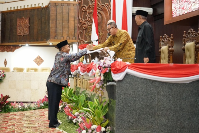 Caption Foto : Anggota Banggar DPRD Jatim, Basuki Babbusalam saat menyerahkan laporan Banggar DPRD Jatim ke pimpinan DPRD Jatim yang disaksikan Plh Gubernur Jatim, Bobby Soemarsiono