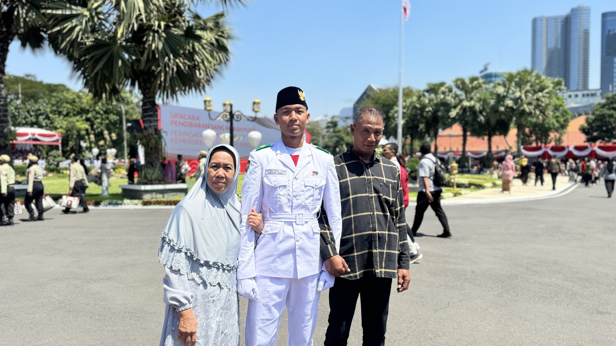 Namun tidak demikian bagi orangtua dari salah satu anggota Paskibraka Provinsi Jawa Timur, Muhamad Noval Alfian (16th). Kedua orang tuanya rela naik sepeda motor dari Kabupaten Jombang ke Surabaya untuk melihat anaknya secara langsung menjalankan tugas sebagai penegerek bendera.