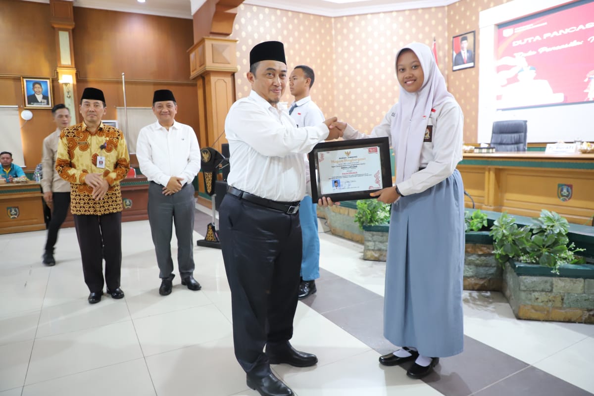 Caption Foto : Pj Bupati Jombang saat menyerahkan prestasi pada peserta Paskibraka