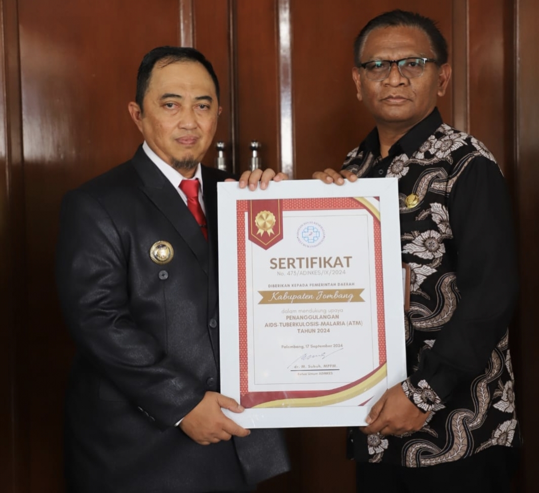 mediapetisi.net – Kinerja Pemerintah Kabupaten Jombang bidang kesehatan dalam upaya pencegahan dan penanggulangan penyakit AIDS, Tuberculosis (TBC), dan Malaria (A/T/M) Tahun 2024 diapresiasi oleh Asosiasi Dinas Kesehatan seluruh Indonesia (ADINKES) sebagai kepanjangan tangan Kementerian Kesehatan Republik Indonesia. Penghargaan yang diserahkan oleh Ketua Umum Pengurus Pusat ADINKES dr. M. Subuh, MPPM., tersebut diterima langsung oleh Kepala Dinas Kesehatan Kabupaten Jombang, Jawa Timur dr Hexawan Tjahja Widada MKP dalam Pertemuan Nasional ADINKES di Beston Hotel, Palembang pada Selasa malam (18/09/2024)