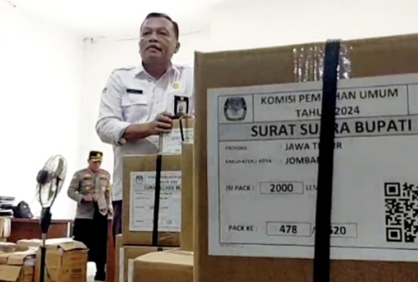 Caption Foto : Kasubag Keuangan, Umum dan Logistik KPU Jombang, Heri Subagyo, saat menerima logistik surat suara