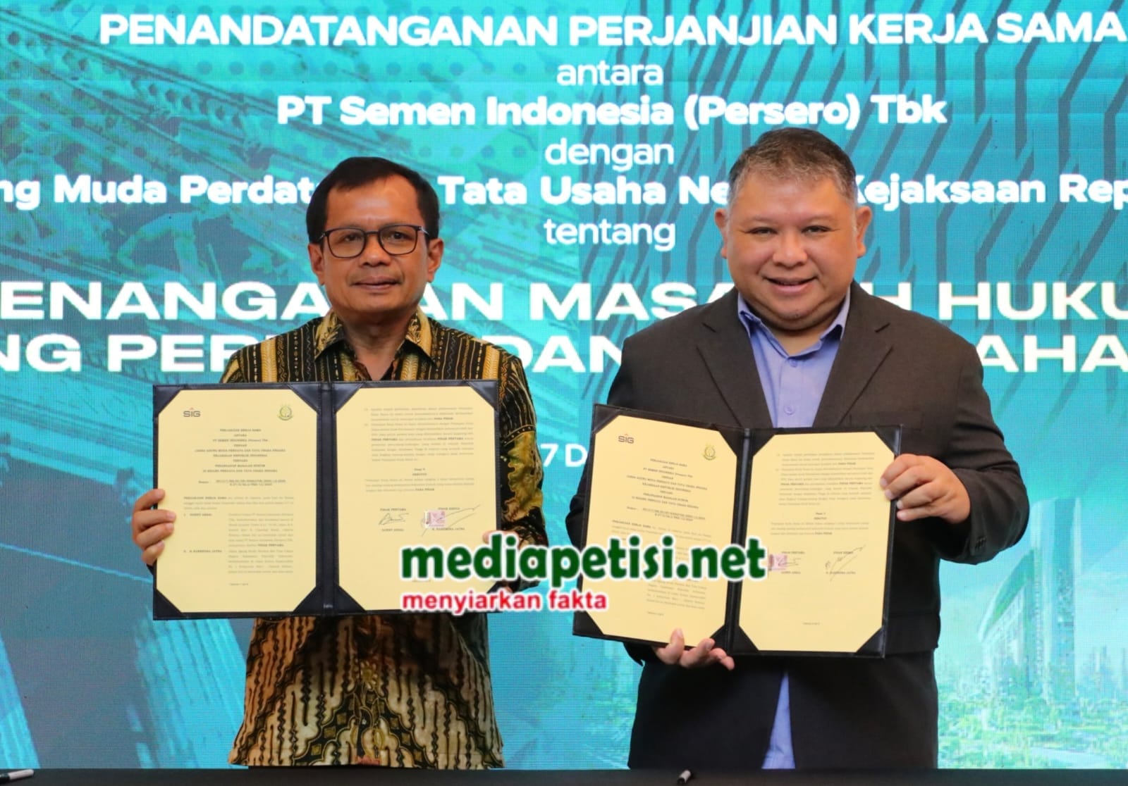Penandatanganan ini dilaksanakan oleh Jaksa Agung Muda Perdata dan Tata Usaha Negara (JAM-Datun) R. Narendra Jatna dan Direktur Utama SIG Donny Arsal. Acara ini juga diisi dengan sharing session tentang “Business Judgment Rule” untuk memperkuat pemahaman para pemangku kepentingan dalam pengambilan keputusan bisnis yang bertanggung jawab.