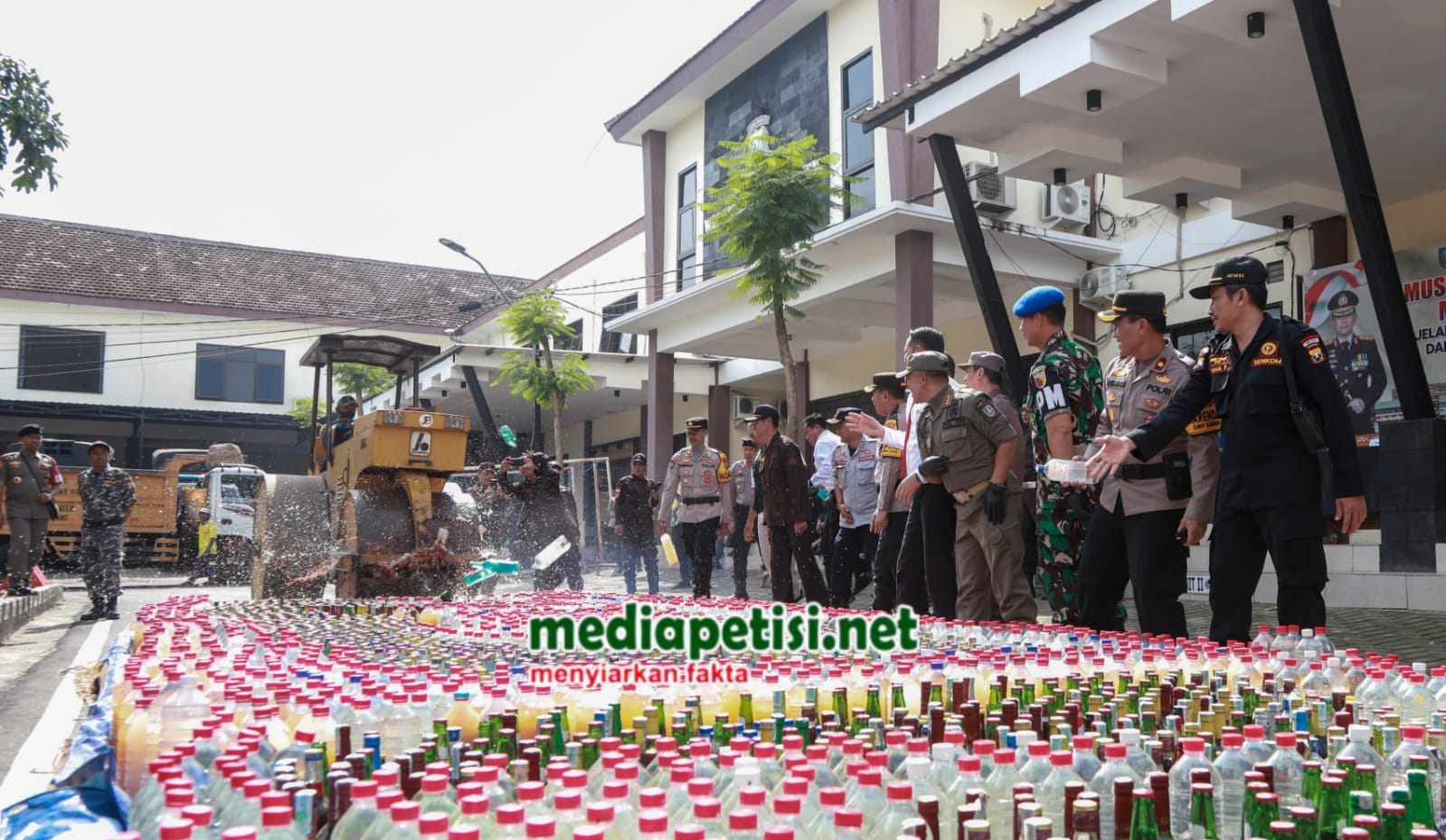 mediapetisi.net – Ribuan botol minuman keras (miras) berbagai merek dimusnahkan oleh Polres Jombang bersama jajaran Forkopimda dan pihak terkait di depan kantor Satresnarkoba Polres Jombang. Jumat (20/12/2024)