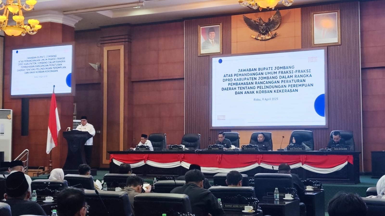 mediapeyisi.net – Rapat Paripurna DPRD Kabupaten Jombang Jawaban Bupati Atas Pemandangan Umum Fraksi DPRD dalam Pembahasan Rancangan Peraturan Daerah (Raperda) tentang Perlindungan Perempuan dan Anak Korban Kekerasan dipimpin oleh Ketua DPRD Jombang Hadi Atmadji. Dihadiri Wakil Bupati Jombang, Wakil Ketua dan Anggota DPRD, Forkopimda, Staf Ahli, Asisten, Kepala OPD, Pimca Bank Jatim, Direktur BUMD, Kabag dan Canat. Rabu (9/4/2025)